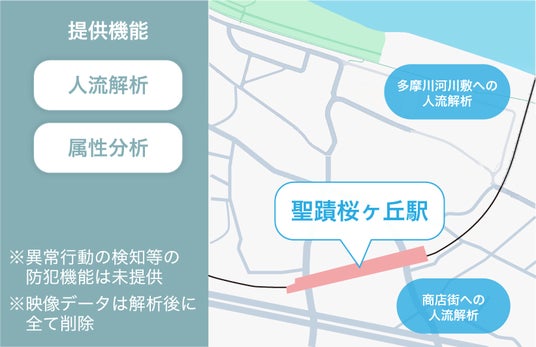 Secual AI Cameraが提供する高精度の人流解析機能が、公共空間や商業施設における混雑状況の可視化やエリアの最適活用をサポートすることで、多摩川沿いにある「せいせきカワマチ」エリアにおける賑わいの創出と、商店会連携施策等による回遊性向上の取組効果を検証。聖蹟桜ヶ丘エリアの商店街入口など2ヶ所に設置し、2025年2月より稼働を開始いたします。今後は、順次設置場所の拡大やSecual Smart Poleも活用したエリアマネジメントのサポート強化を検討してまいります。