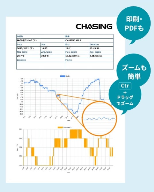 「CHASING Log Viewer(β版)」は、CHASING M2シリーズの水中ドローンから取得したログデータを分析し、水深や水温の変化をグラフで可視化します。特徴は以下の通りです。