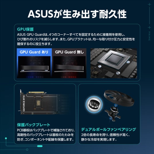 ASUS GPU Guardは、4つのコーナーすべてを固定するために接着剤を使用し、ひび割れのリスクを減らします。また、GPUブラケットは、均一な取り付け圧力と安定性を確保するのに役立ちます。