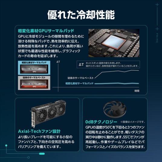 GPU温度が50°C未満でファン停止、55°C以上で再起動し、性能と静音を両立。