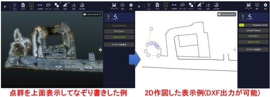 Dot3Dでスキャンした点群データを上面に表示し、輪郭線をなぞり書きして2D作図を実行した例