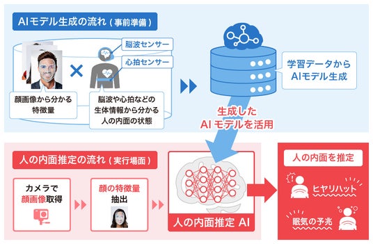 脳波・心拍など生体情報と顔の特徴量の関係を学習し、ヒヤリハットや居眠りの予兆を検出
