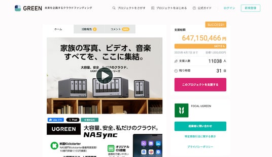 フォーカルポイント株式会社(本社:神奈川県横浜市、代表取締役 恩田英樹 以下フォーカルポイント)が起案し、現在公開中のプロジェクト「UGREEN NASyncシリーズ」が、開始から22日間で約11000人の支援者から6億4700万円を超える支援を集めています。これにより日本国内のクラウドファンディングにおける購入型プロジェクトにおいて、史上最高支援額を更新しました(*1)。