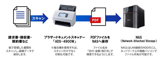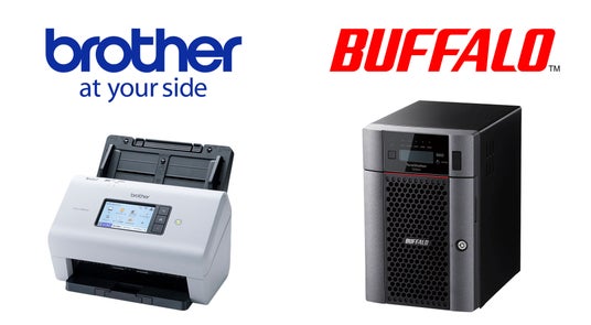 ブラザー工業株式会社(本社:名古屋市 社長:池田和史)の国内販売子会社であるブラザー販売株式会社(本社:名古屋市 社長:安井宏一)は、ドキュメントスキャナーとレーザー複合機、インクジェットプリンターで、メルコホールディングスグループの株式会社バッファロー(社長︓牧寛之、以下バッファロー)の法人向けNAS「TeraStationシリーズ」との相互動作検証を行った。両商品を組み合わせることで、紙で受領した請求書などの書類をスキャンし、PC操作なしで直接、ネットワーク上の複数の端末でファイルが共有できるNASに電子データで保存できるようになる。