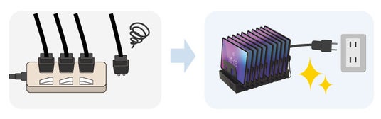 本製品は、タブレットやノートPCを10台まとめて急速充電できるUSB充電器です。