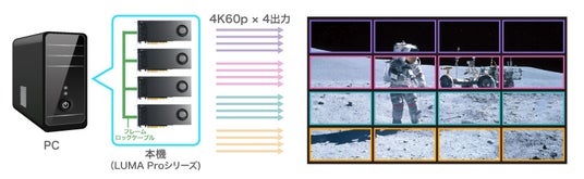 当製品は、1枚で最大8K×2系統、または4K×4系統出力が可能です。4枚のボードを連結して最大16面の大型ビデオウォールを実現します。