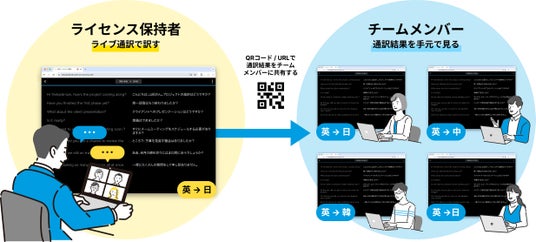 ライセンス保有者が共有用の二次元コード、もしくはURLを発行し、同じ会話に参加するメンバーがアクセスすることで、それぞれが選択した言語による通訳結果をそれぞれの手元のデバイスで確認することができます。