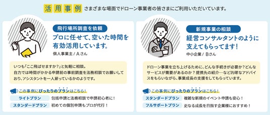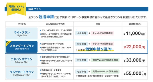 従来ご好評いただいていた法務相談サービスをリニューアルし、飛行に欠かせない包括申請や個別申請も無料で代行。より充実した法務サポートで、ドローン事業者のビジネス成長を後押しいたします!