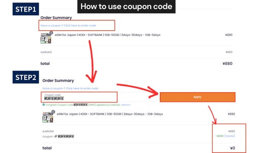 このキャンペーンでは、InstagramのDMを活用したクーポンの直接配布方式を採用しており、クーポンを購入前に適用することで対象商品の「Japan eSIM | KDDI / SoftBank | 1GB / 3 days plan」が割引され無料になります。