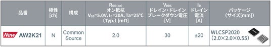 ローム株式会社(本社:京都市)は、2.0mm×2.0mmのパッケージサイズで業界トップとなるオン抵抗(*1) 2.0mΩ(Typ.)のNch 30V耐圧コモン・ソース構成のMOSFET(*2)「AW2K21」を開発しました。