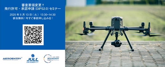 無人航空機の操縦に関する教育、指導および資格認定や登録講習機関として国家資格向け講習を展開する日本無人航空機免許センター株式会社(本社:東京都千代田区、代表取締役:松本 篤史、以下 JULC)とエアロエントリー株式会社(同)、バウンダリ行政書士法人(本社:東京都千代田区、代表行政書士:佐々木 慎太郎)は、共同でライブ配信オンラインセミナー「審査要領変更!!飛行許可・承認申請(DIPS2.0)セミナー」を、2025年5月13日(火)13:30より開催します。