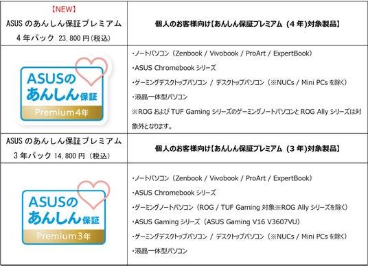 ASUS JAPAN株式会社は、メーカー保証対象とならない自損故障にも対応し、修理費用の自己負担額を最小限に抑えることができる「ASUSのあんしん保証」サービスのうち、個人のお客様向けに提供している「ASUSのあんしん保証プレミアム」にて、既存の3年パックに加え、新たに4年パックを追加することを発表いたしました。