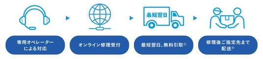 万が一修理が必要になってしまった場合、オンラインで修理申し込みが可能で、「あんしん保証」または「あんしん保証プレミアム」に加入していれば、無料で指定先への製品の引き取り及び修理後の配送サービスを受けることができるため、ご自宅やオフィスにいながら、簡単に修理の手配を行うことが可能です。