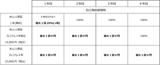 メーカー保証外故障に対して、保証期間中12か月間を1期間とし、規定のサービス回数分(各期間中最大1回)、無償で修理対応を提供いたします。なお、加入された保証の期間中に発生した自然故障(メーカー保証内故障)に対しては、規定のサービス回数を減らすことなく、何度でも無償で修理対応を提供いたします。