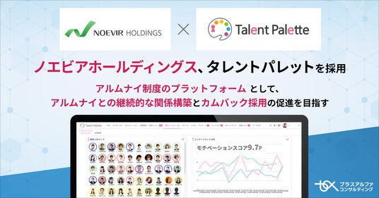 株式会社プラスアルファ・コンサルティング(本社:東京都港区、代表取締役社長:三室克哉 証券コード:4071)は、データに基づく人材活用や採用業務の効率化・高度化、人事業務のDX化、リスキリングの推進などを目的に、多くの大手企業で導入が進んでいるタレントマネジメントシステム「Talent Palette(以下:タレントパレット)」をアルムナイ制度*のプラットフォームとして株式会社ノエビアホールディングス(本社:神戸市中央区、以下:ノエビアHD)に導入いただきましたことをお知らせいたします。