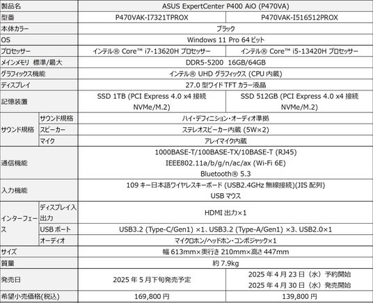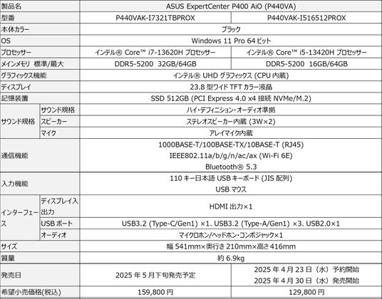 ASUS JAPAN株式会社は、法人向けノートPC「ExpertBookシリーズ」2製品6モデル、および一体型PC「ExpertCenter P400シリーズ」2製品4モデルを発表しました。高性能と携帯性を備えたノートPC「ExpertBook P3」シリーズ、省スペースでスタイリッシュなデザインが特長の法人向け一体型PC「ExpertCenter P400シリーズ」をラインアップし、さまざまなビジネスシーンにおける生産性向上と快適な作業環境の実現を支援します。各製品は、本日2025年4月23日(水)より予約を開始します。