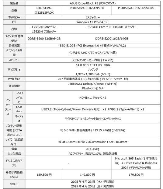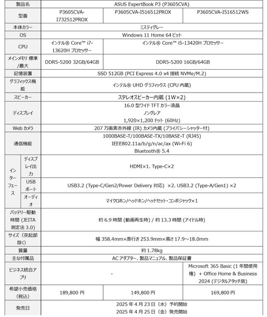 本製品の発売を記念して、2025年5月16日(金)12時までに「ExpertBook P3」シリーズおよび「ExpertCenter P400シリーズ」を含む法人&学生向け製品を、割引価格で購入いただけるセールを実施いたします。対象製品および割引価格は下記よりご確認ください。https://www.asus.com/jp/deals/business-epp/