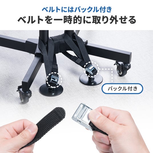 パーツにはバックルが付いており、固定しながらもテレビスタンドの一時移動が可能です。掃除やレイアウト変更の際もラクラク対応。