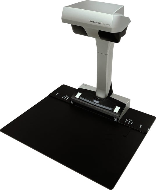 ScanSnap SV600は、原稿を上から読み取る非接触のオーバーヘッド型イメージスキャナーです。スキャナー上部の読み取りユニット(高指向性LED光源)より光を照射し、原稿を読み取るため、周囲の明るさの影響を低減し、画質ムラのない鮮明な画像を生成します。また、ボタンをワンプッシュするだけでスキャンを開始し、製本された書類や冊子、袋綴じされた契約書、ステープル留めされた資料なども、簡単にデジタル化できます。