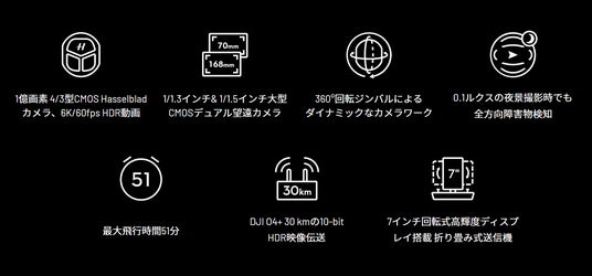 さらに360° 回転可能なジンバルでダイナミックなカメラワークを実現し、0.1ルクスの夜景撮影時でも全方向の障害物を検知して安全な飛行が可能です。最大飛行時間は51分、電波干渉の多い環境でも安定した通信を可能にする DJI O4+ 伝送システムを搭載し、10-bit HDRの高品質映像を長距離伝送でき、映像制作をサポートします。また7インチ回転式高輝度ディスプレイを搭載した折り畳み式の DJI RC Pro 2 送信機を併用することで、高い視認性と操作性を実現します。