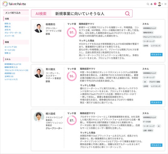 株式会社プラスアルファ・コンサルティング(本社:東京都港区、代表取締役社長:三室克哉、証券コード:4071、以下:PAC)は、科学的な人材活用や人的資本の開示、人事業務のDX化、リスキリング推進などを目的に、多くのエンタープライズ企業で導入が進んでいるタレントマネジメントシステム 「Talent Palette(以下:タレントパレット)」 に蓄積された、社員の所属部門やスキル・経験、性格傾向、キャリア希望といった人材情報から、社内人材を発掘しスカウトできる 「タレントリーチ(社員スカウト)機能」 を新たに搭載します。