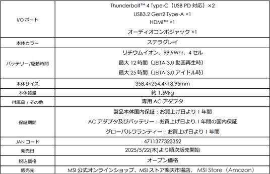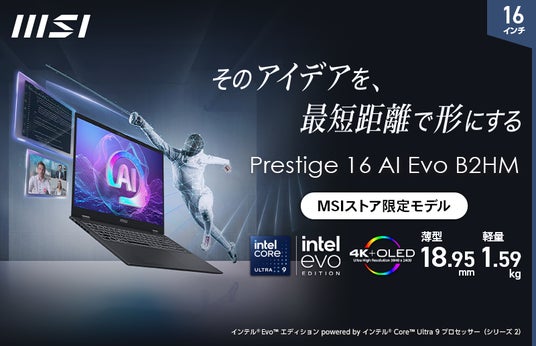 この度、エムエスアイコンピュータージャパン株式会社は、AI専用プロセッサー「NPU」を内蔵した高性能CPU「インテル(R) Core(TM) Ultra 9 プロセッサー(シリーズ 2)」を搭載し、高速処理性能によりビジネスを加速させ、AI機能で業務を効率化するビジネスAI ノートPC「Prestige-16-AI-Evo-B2HMG-0651JP」をMSI公式オンラインショップ(以下、MSIストア)にて2025年5月22日(木)より順次発売いたします。