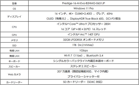 【Prestige-16-AI-Evo-B2HMG-0651JPの主な特徴】