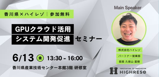 GPUクラウドサービス「GPUSOROBAN」を展開する株式会社ハイレゾ(本社:東京都新宿区、代表取締役:志倉喜幸、以下当社)は、香川県主催、香川県スマートシステム技術研究会が共催する「GPUクラウド活用 システム開発促進セミナー」に登壇いたします。