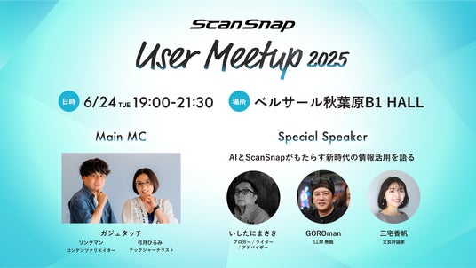 株式会社PFUが販売するイメージスキャナー「ScanSnap」は、6月24日に「ScanSnapユーザーミートアップ2025」を、ベルサール秋葉原にて開催します。この規模での開催は、7年ぶり(2018年以来)となります。