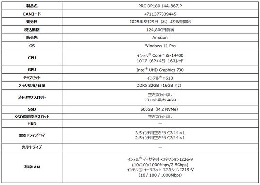 この度、エムエスアイコンピュータージャパン株式会社は2025年5月29日(木)よりビジネス向けデスクトップPCブランド『PRO DP』シリーズより、第14世代インテル(R) Core(TM) i5-14400、大容量32GBメモリ、超高速SSDを搭載し、ビジネス用途に最適なWindows 11 Proプリインストール済みモデル「PRO DP180 14A-867JP」が新たにラインナップに加わります。