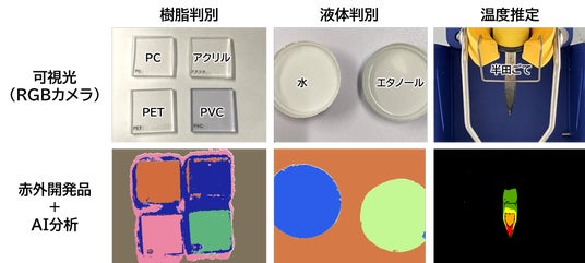 RGBカメラ撮影画像(上画像)と、ハロゲンランプを用いた短波赤外ハイパースペクトルカメラ試作機で撮影しAI分析を行った画像(下画像)の比較。(左図)樹脂判定、(中央図)液体判断、(右図)半田ごての温度分布。短波赤外ハイパースペクトルカメラの使用により、目視やRGBカメラでは判別が困難な透明な物質の識別や、温度の推定が可能になります