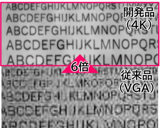 開発したハイパースペクトルカメラと従来品の解像度比較:一般的な室内照明(約550ルクス)下で、従来のハイパースペクトルカメラで一般的なVGAの解像度で文字列を撮影した例(下画像)では、小さな文字が明瞭に見えないのに対し、試作機(上画像)は最大4Kの解像度を実現し、小さな文字まで識別できます