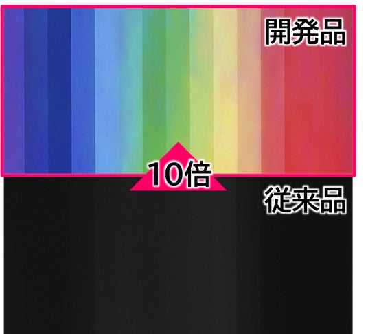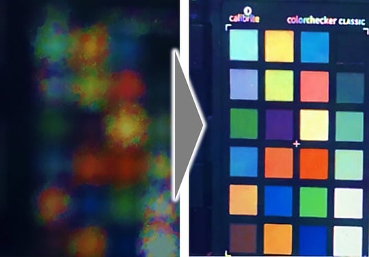 開発したハイパースペクトルカメラと従来品の感度比較:一般的な室内照明環境(約550ルクス)下で、従来のハイパースペクトルカメラのゲイン値0dBかつ露光時間20msでカラーチャートを撮影した例(下画像)では、画像が暗くなり色の識別ができないのに対し、試作機(上画像)では明瞭に撮影できています