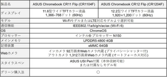 ○ASUS Chromebook CR11 Flip(CR1104F)CR1104FTAシリーズ11.6型 / ASUS Chromebook CR12 Flip(CR1204F)CR1204FTAシリーズ 12.2型ディスプレイ搭載製品の主なスペック