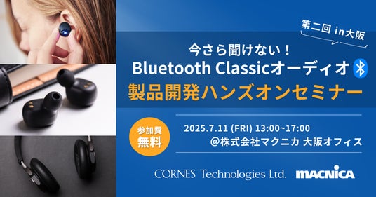 コーンズテクノロジー株式会社(本社:東京都港区、代表取締役社長 西岡和彦)は、2025年7月11日(金)に「今さら聞けない!Bluetooth Classicオーディオ 製品開発ハンズオンセミナー」を大阪にて開催いたします。