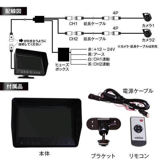 別売の専用カメラと接続する場合、カメラの電源はモニターから供給できるので簡単に配線可能です。