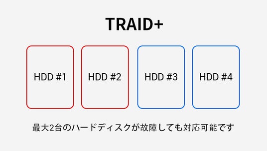 TRAIDは、1台冗長の「TRAID」と、2台冗長の「TRAID+」の2モードに対応しています。運用の安全性や信頼性に応じて、最適な保護レベルを選べます。