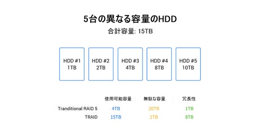 たとえば、1TB+2TB+4TB+8TB+10TBのHDD構成では、TRAIDは1台分の冗長を確保しつつ、最大15TBの使用が可能です「RAID5では最大4TB」。