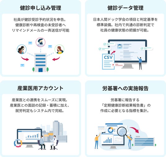 また、健康データの分析を通じた不調者の早期発見や、健康診断の予約確認や未受診者へのリマインドの自動化など、健康経営の促進をサポートします。