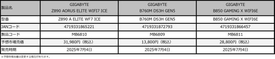 ドスパラ限定モデルマザーボード、Intel(R) Z890 Expressチップセットを搭載した「GIGABYTE Z890 AORUS ELITE WIFI7 ICE」およびIntel(R) B760 Expressチップセットを搭載した「GIGABYTE B760M DS3H GEN5」の2製品と AMD B850 チップセットを搭載した「GIGABYTE B850 GAMING X WIFI6E」の1製品を2025年7月4日に発売いたします。