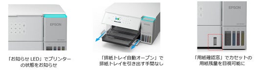 ・利便性の向上(お知らせLED搭載・排紙トレイ自動オープン・用紙の残量が見える用紙確認窓)