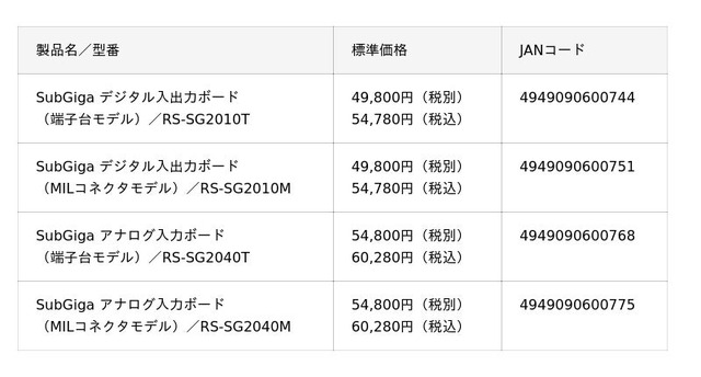 SubGiga 対応インターフェイスボード、2種4製品をラインナップ