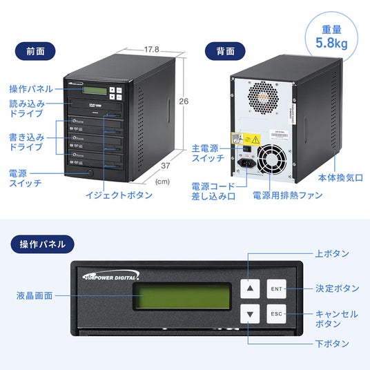 本製品はパソコンを一切使用せず、CD/DVDを最大3枚同時にコピーできるスタンドアロン型デュプリケーターです。専門知識がなくてもすぐに使える設計で、最大3枚まで同時にコピーできるため、企業の資料配布やイベントでのメディア提供に最適です。