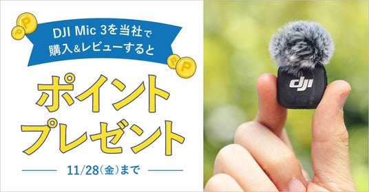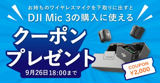 対象メーカーのワイヤレスマイク製品の中古買取査定をお申し込みいただくと、新製品「DJI Mic 3」をおトクにお求めいただける特別クーポンをもれなくプレゼントいたします。