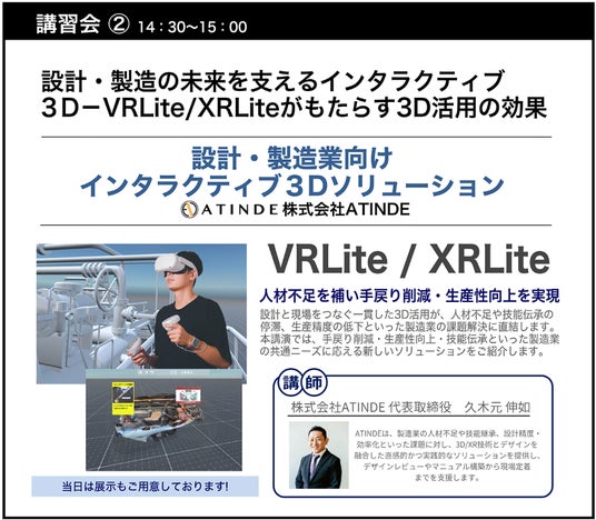 内容: 人材不足や技能伝承といった課題に対し、3D/XR技術で設計と現場をつなぐソリューション『VRLite / XRLite』を解説。設計レビューでの手戻り削減や、現場作業の効率化・人的ミス削減にどう貢献するかを、実践的な視点でお話しします。