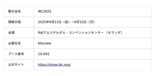 Kiloview社は、2025年9月12日(金)から15日(月)まで、オランダ・アムステルダムのRAIアムステルダム・コンベンションセンターで開催される「IBC 2025」に出展いたします。