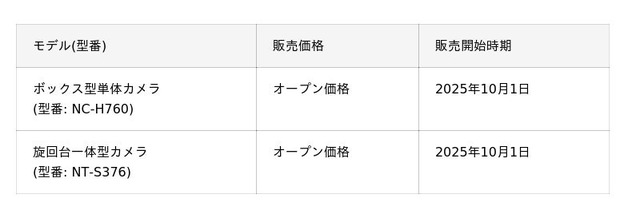 NECプラットフォームズは、人の目では対象物を認識できない夜間や暗所でも鮮明なデジタル撮像が可能な高感度カメラのミドルクラスにおいて、低ノイズ化機能を搭載した新モデルのボックス型単体カメラ(型番: NC-H760)と旋回台一体型カメラ(型番: NT-S376)を10月1日から販売開始します。