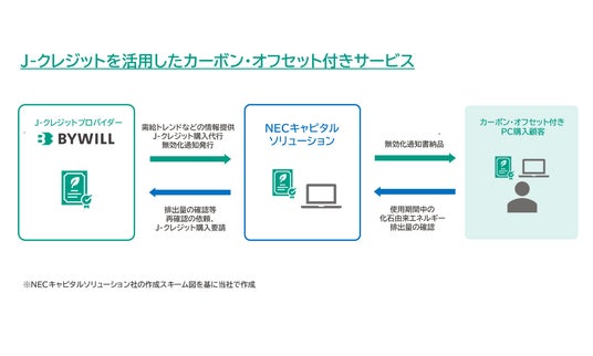 株式会社バイウィル(本社:東京都中央区、代表取締役社長:下村 雄一郎、以下「バイウィル」)は、NECキャピタルソリューション株式会社(本社:東京都港区、代表取締役社長:菅沼 正明、以下「NECキャピタルソリューション」)が新たに開始するJ-クレジットを活用したカーボン・オフセット付きサービス」 に対し、「再生可能エネルギー(電力)」由来のJ-クレジットの購入代行や情報提供を通じて、NECキャピタルソリューションのサービスを支援します。
