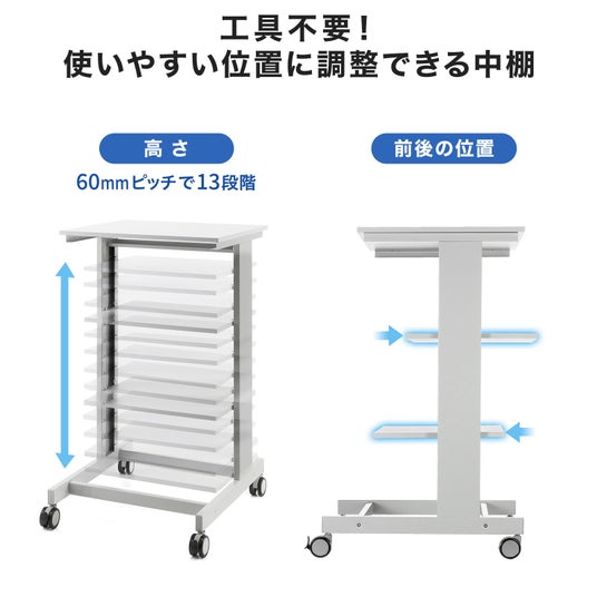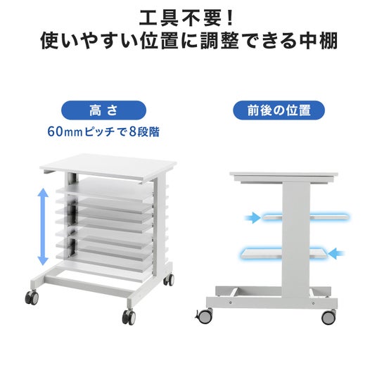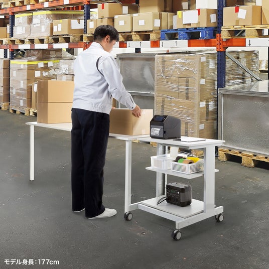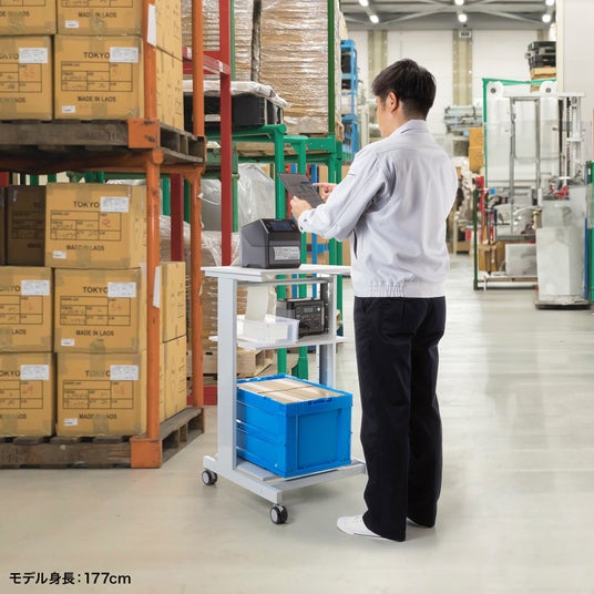 例えば天板にラベルプリンター、中棚にポータブル電源を載せれば、電源供給が難しい工場・倉庫の現場でもラベルの発行作業がスムーズに行えます。製品ピッキングカートや検品端末用カートとしても使用できます。キャスター付きで移動もラクです。