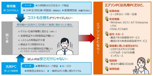専用機は高耐久、24時間365日保証などのメリットがありますが、オーバースペックになりがちです。一方エプソンのWindows 11/10 IoT Enterprise LTSC 搭載モデルは、汎用PCでありながら以下の点で強みがあります。